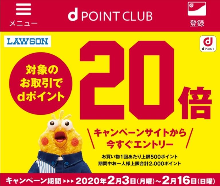 ローソンにてdポイントカードで対象の取引をするとdポイントを20倍もらえるキャンペーン。