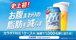 LINEでの応募になります。キャンペーンページの「参加する」をタップし、動画視聴後、アンケートに回答して応募すると、カラダFREE 350ml缶 1ケース(24本)が抽選で1,000名に当たりますよ~。応募は20歳以上限定ナリ。