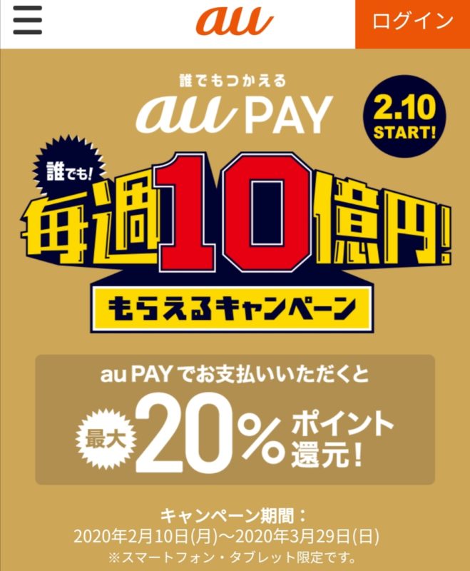 auPAYというと、auユーザーが恩恵を受けるイメージがありますが、今回のキャンペーンは誰でも最大20%還元の恩恵をうけることが可能!