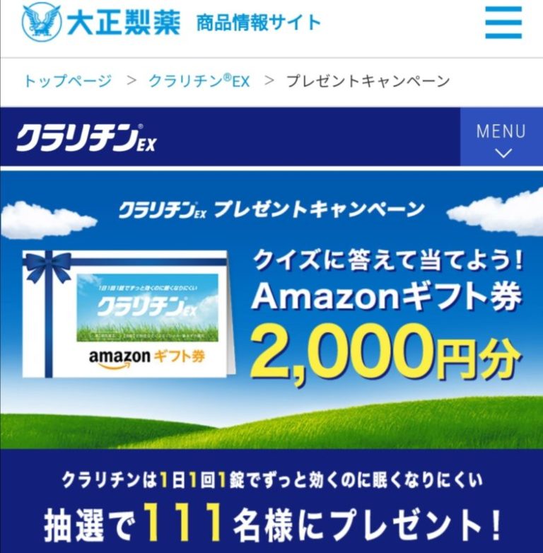 終了大正製薬 クラリチンのクイズに答えるとAmazonギフト券2,000円分が111名に当たるキャンペーン(20/2/28 17時まで)