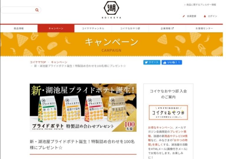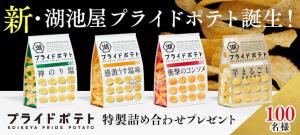 新・湖池屋プライドポテト誕生!新商品4種類6袋入の詰め合わせが100名様に当たるキャンペーンです。このキャンペーンは「コイケなおやつ部」会員限定のプレゼントですが、会員登録は同じページから簡単にできます。