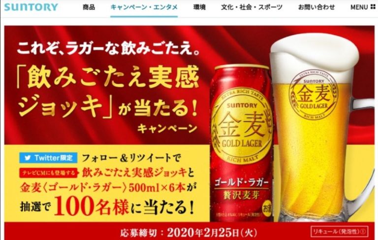 サントリー公式Twitterアカウント「@suntory」をフォローして、「#飲みごたえ実感ジョッキ」「#金麦ゴールドラガー」のついた指定のキャンペーン投稿をリツイートすると、抽選で100名に「飲みごたえ実感ジョッキ1個と金麦〈ゴールド・ラガー〉500ml×6本」が当たります。とても簡単!応募は20歳以上ナリ。