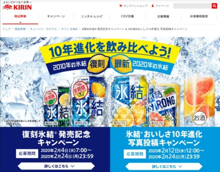 氷結の10年の進化を飲み比べできるキャンペーン。当選すると復刻版と最新版が1本ずつもらえます。さて、味の違いを実感できるのか!あまり何も言わずに2種類をグラスに入れて家族に飲ませてみるのも面白いかも知れませんね。