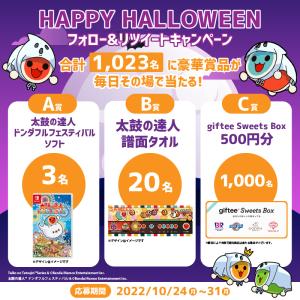 バンダイナムコエンターテインメント公式Twitterアカウント(@bnei876)をフォローし、キャンペーン対象ツイートをリツイートするとNintendo Switch用ゲームソフト「太鼓の達人 ドンダフルフェスティバル」や「giftee Sweets Box 500円分」など抽選で合計1,023名に当たりますよ~!