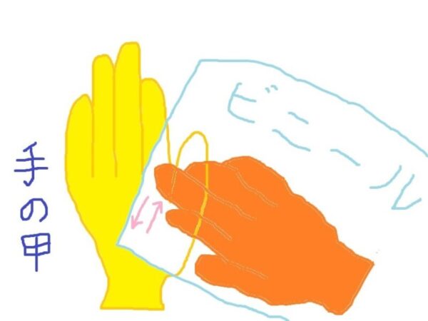 手の甲にビニールの一方が引き寄せられ