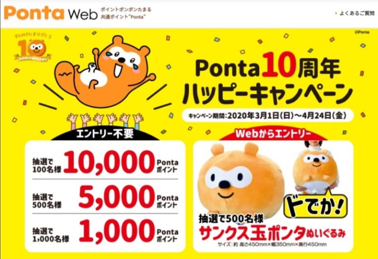 キャンペーンページからエントリーした人には、抽選で合計500名にサンクス玉ポンタぬいぐるみが当たります。