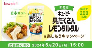 キャンペーンページの応募フォームにてアンケート回答と必要事項を入力して応募すると、キユーピー「キユーピー 具だくさんレモンタルタル 145g 2本」が抽選で200名に当たりますよ~。プレゼント商品到着後のアンケートにも答えるのが応募条件ナリ。