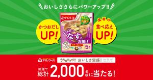 アマノフーズ公式X(Twitter)アカウント(@amano_shokudo)フォローし、キャンペーン対象ツイートをリポストすると「アマノフーズ うちのおみそ汁 なすとお揚げ5食 1袋」が抽選で総計2,000名に当たりますよ~。