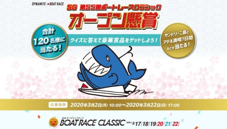 SG 第55回ボートレースクラシック オープン懸賞。とてつもなく簡単なクイズに答えると豪華賞品が120名に当たるキャンペーン。協賛企業が多く賞品がバラエティーに富んでおり、しかも選べるため、欲しいものを選ぶか、当たりやすいものを選ぶか、戦略が必要。選択肢が多いのは楽しいですな。応募は20歳以上限定です。