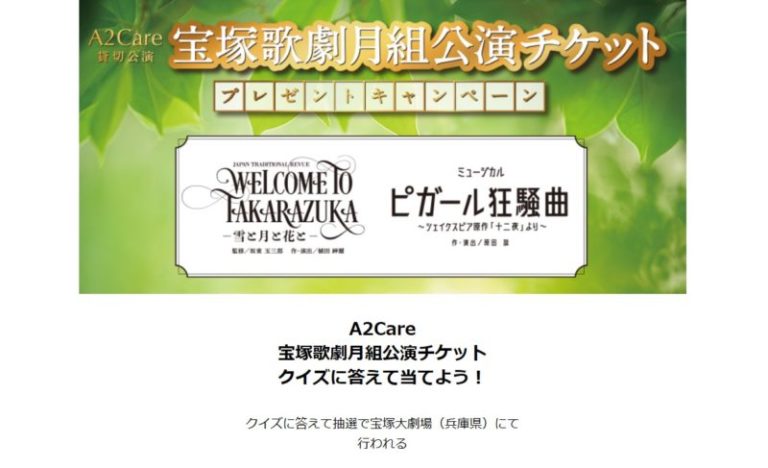 A2Careの簡単なクイズに答えると宝塚歌劇月組公演チケット(S席・A席・B席 300組 600名)が抽選で当たるキャンペーンです。