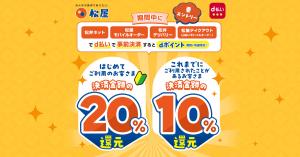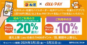 松弁ネット・松屋モバイルオーダー・松弁デリバリー・松弁ネットミニアプリにてキャンペーン期間内に、対象の事前決済(PayPay・d払い・au Pay)で注文すると、決済金額の最大20%相当のポイントが各社から還元されますよ~!還元率など内容は各Payで異なるので要確認。店頭決済は対象外なのでご注意を!