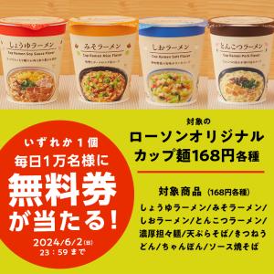 5月29日スタート♪毎日1万名様に抽選で対象の「ローソンオリジナルカップ麺各種」無料券をプレゼント!