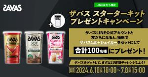 キャンペーンページからザバスLINE公式アカウントを友だち追加して、配信されるキャンペーンのメッセージ、またはトーク画面下部のリッチメニューよりアンケートの回答と希望するコースを選択して応募するとザバス スターターキットが抽選で合計100名に当たりますよ~!