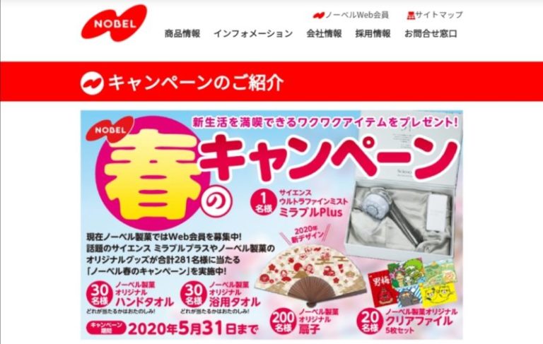 ノーベル春のキャンペーンで、油性マーカーペンで書いた汚れがシャワーだけで落ちるテレビCMで話題の「ウルトラファインミスト ミラブルPlus」や、新デザインのオリジナル扇子など、ノーベルオリジナル商品が合計281名に当たります。
