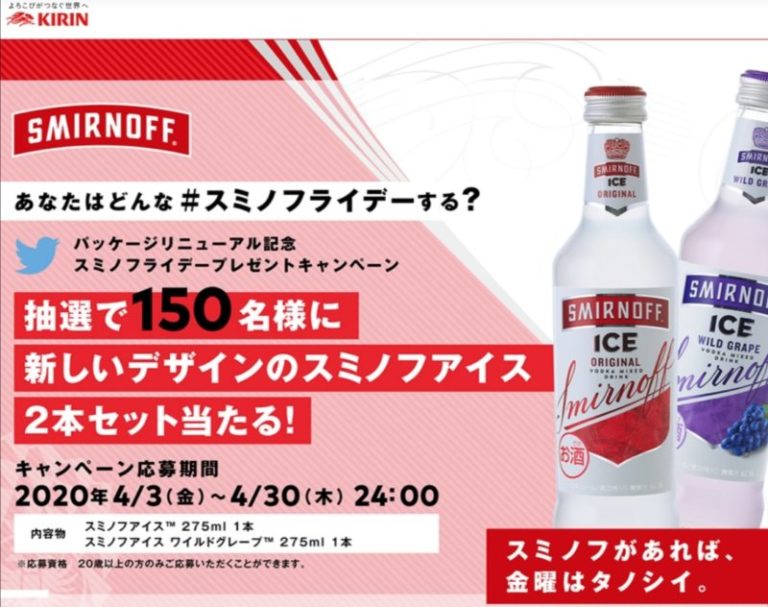 終了【終了】キリン 新しいデザインのスミノフアイス2本セットが150名に当たる!(20/4/30まで)