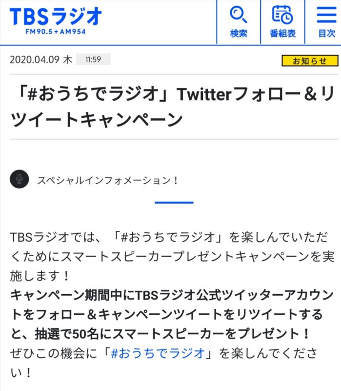 TBSラジオ「#おうちでラジオ」を楽しむためのスマートスピーカープレゼントキャンペーン。Twitterのフォロー&リツイートでスマートスピーカーが50名に当たります。なお、どの会社のスマートスピーカーなのかは不明ナリ。