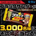 Sky公式Xアカウント(@Sky_corporate)をフォローし、キャンペーン対象ポストをリポストのうえ、対象ポストに記載のURLから応募するとブラックサンダーが抽選で各回1,000名、合計3,000名に当たります!毎日応募可能ですよ~。