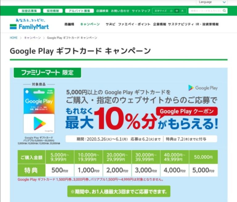 終了ファミマで5,000円以上の対象Google Playギフトカードを購入・応募すると金額に応じて最大10%分がもらえる!(20/6/1まで)