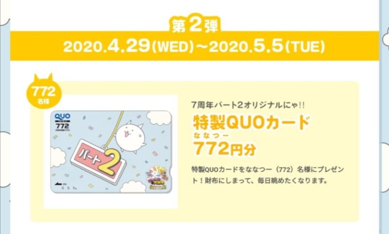 特製QUOカードがななつー(772)名に当たります。ファンなら財布に入れてお守り代わりに。