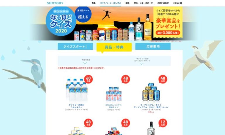 毎回、テーマに沿ったサントリーに関係するクイズに答え、希望する賞品のコースを選んで応募できるキャンペーンです。今回は第3回「超える」がテーマ。2021年1月4日まで全10回応募できますよ。