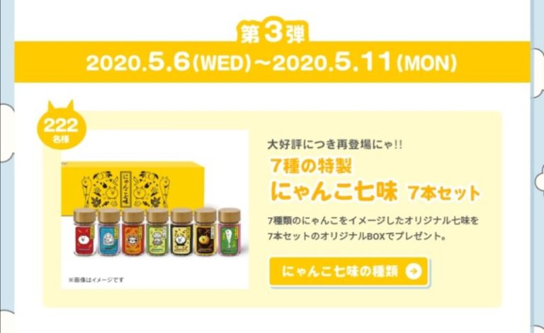 7種類のにゃんこをイメージしたオリジナル七味の7本セットが222名に当たります。なんと、オリジナルBOX入り!ファンなら使わず観賞用。