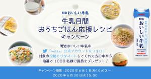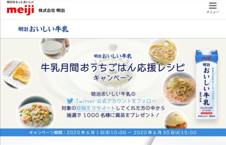 明治おいしい牛乳「牛乳月間おうちごはん応援レシピ」キャンペーン。公式Twitterのフォロー&対象ツイートのリツイートでAmazonギフト券が当たります。毎日応募が可能ナリ。