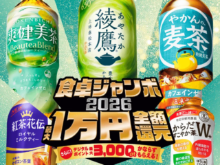 オススメ 綾鷹・爽健美茶・やかんの麦茶・紅茶花伝・からだシリーズの購入&レシート応募で1本につきデジタルポイント30pt必ずもらえる!抽選で1万円全額還元当たるCPも!(26/3/15まで)